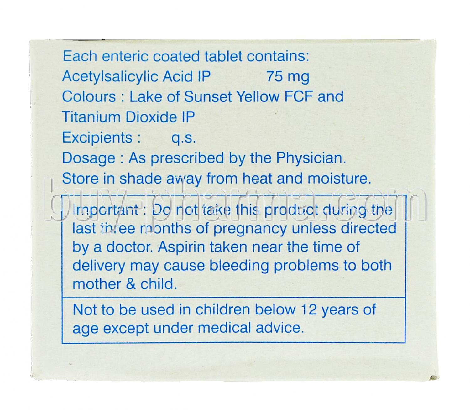 Each tablet may also contain pharmaceutical excipients such as maize starch, microcrystalline cellulose, and hypromellose. The presence of enteric coating distinguishes Ecosprin from uncoated aspirin tablets, reducing direct gastric mucosal contact and thereby mitigating gastrointestinal side effects.
